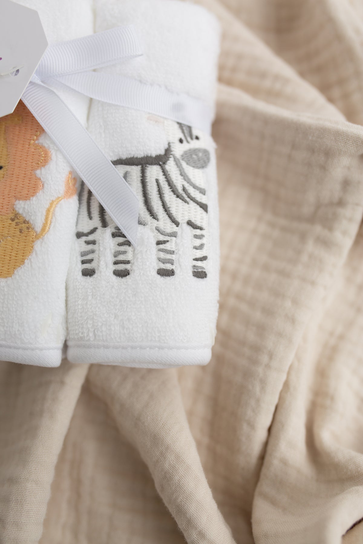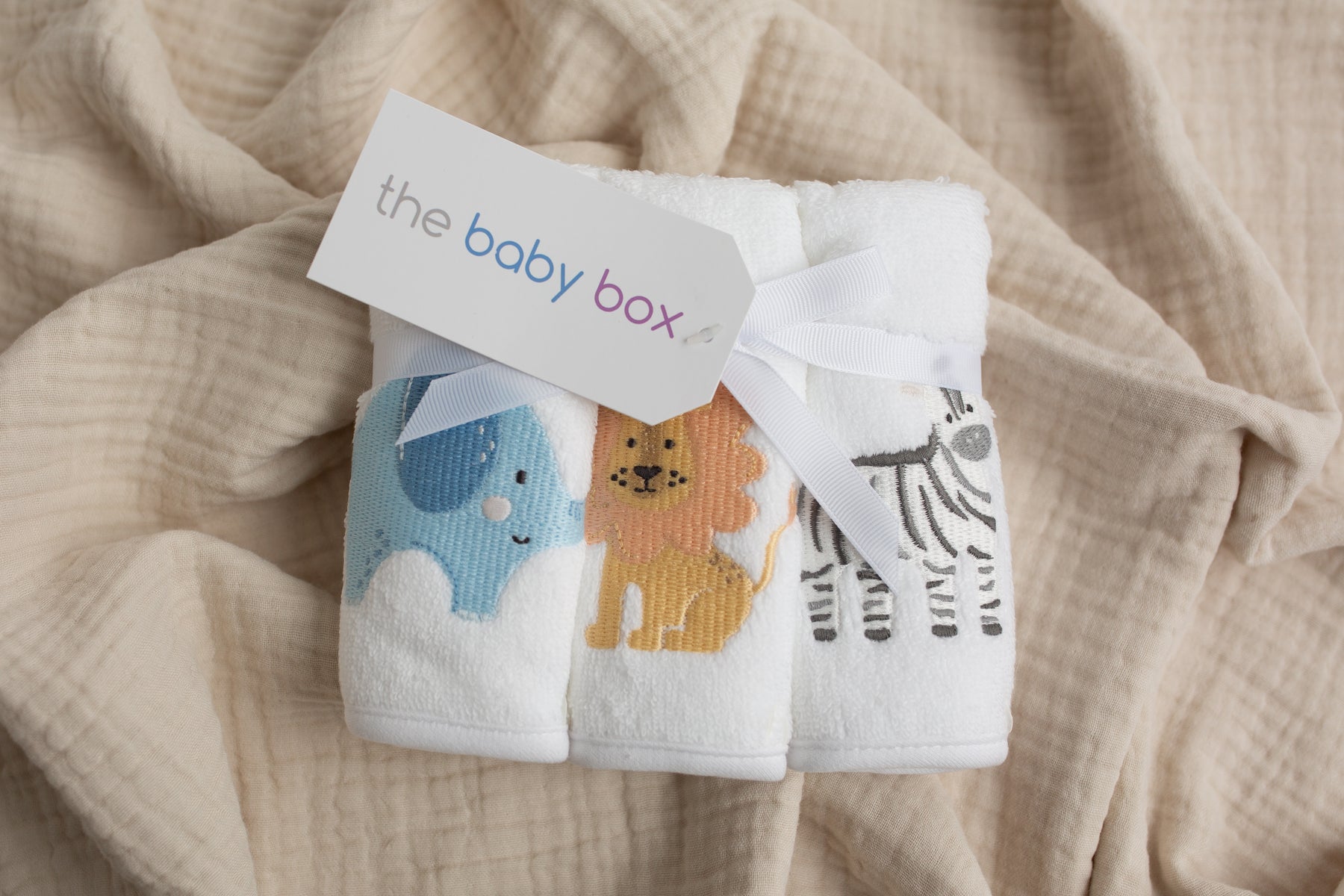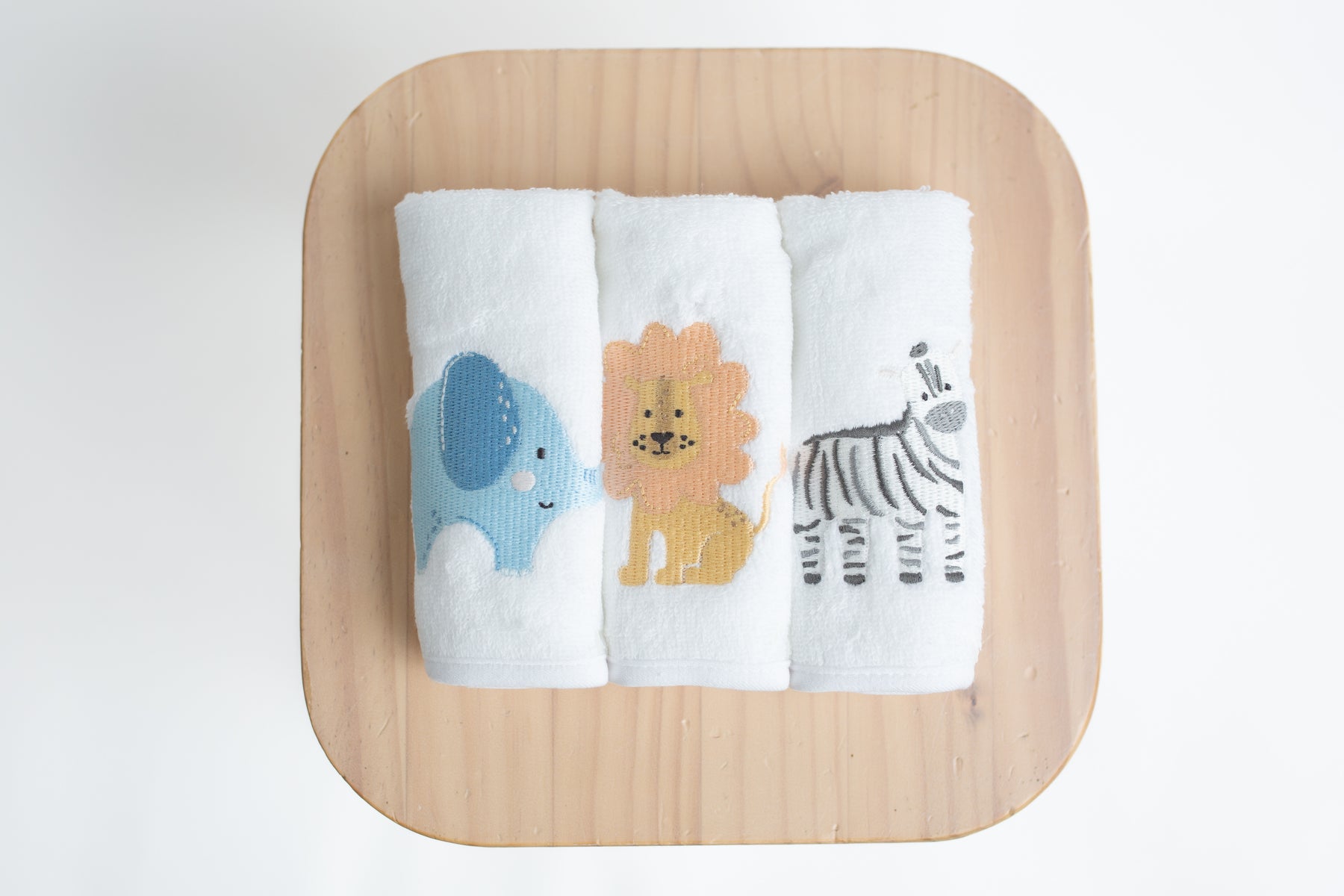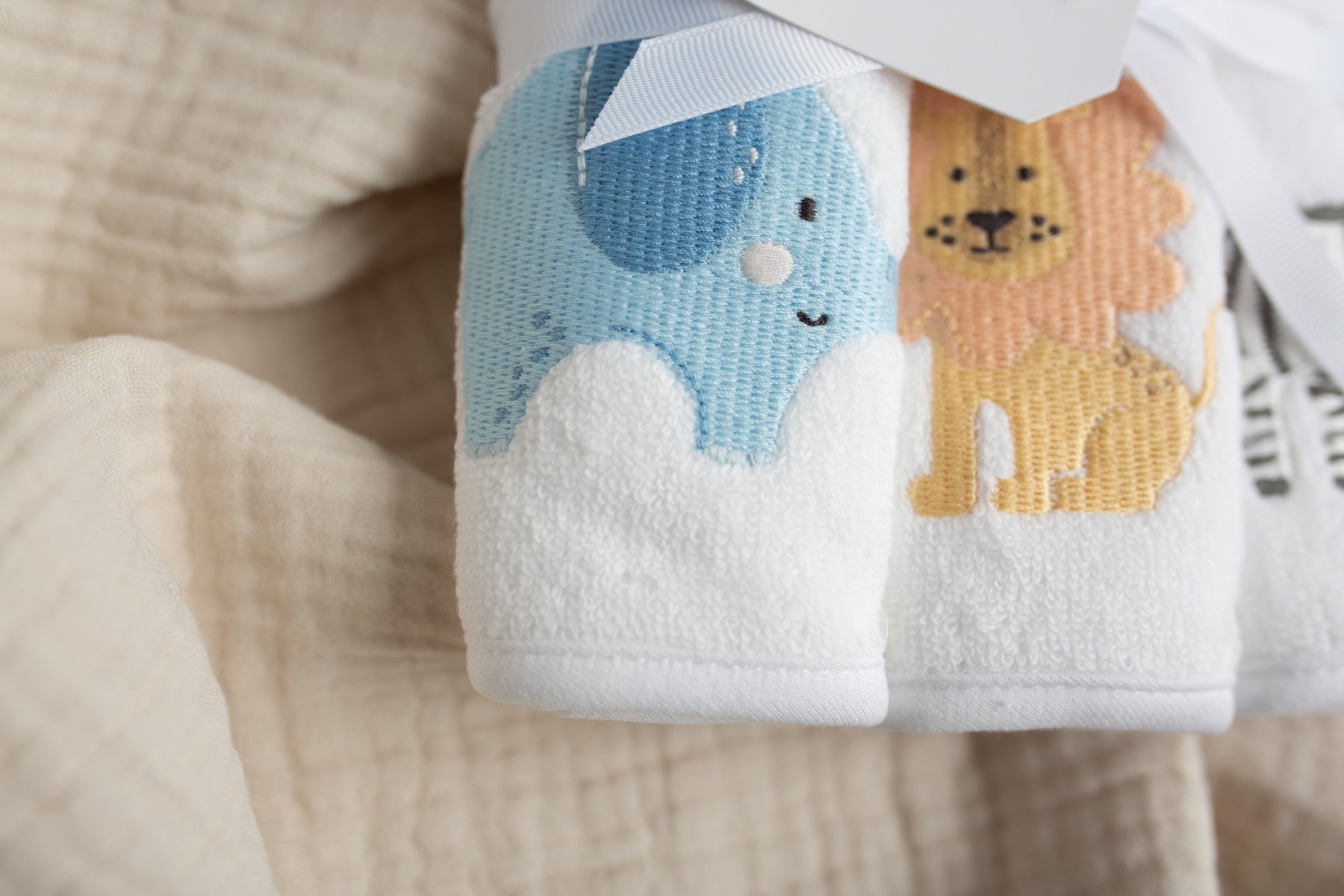 Premium 3-Pack Baby Wash Cloths – Set includes three beautifully designed flannels featuring cute safari animals: elephant, lion, and zebra. Ideal for bath time, feeding, or quick clean-ups.